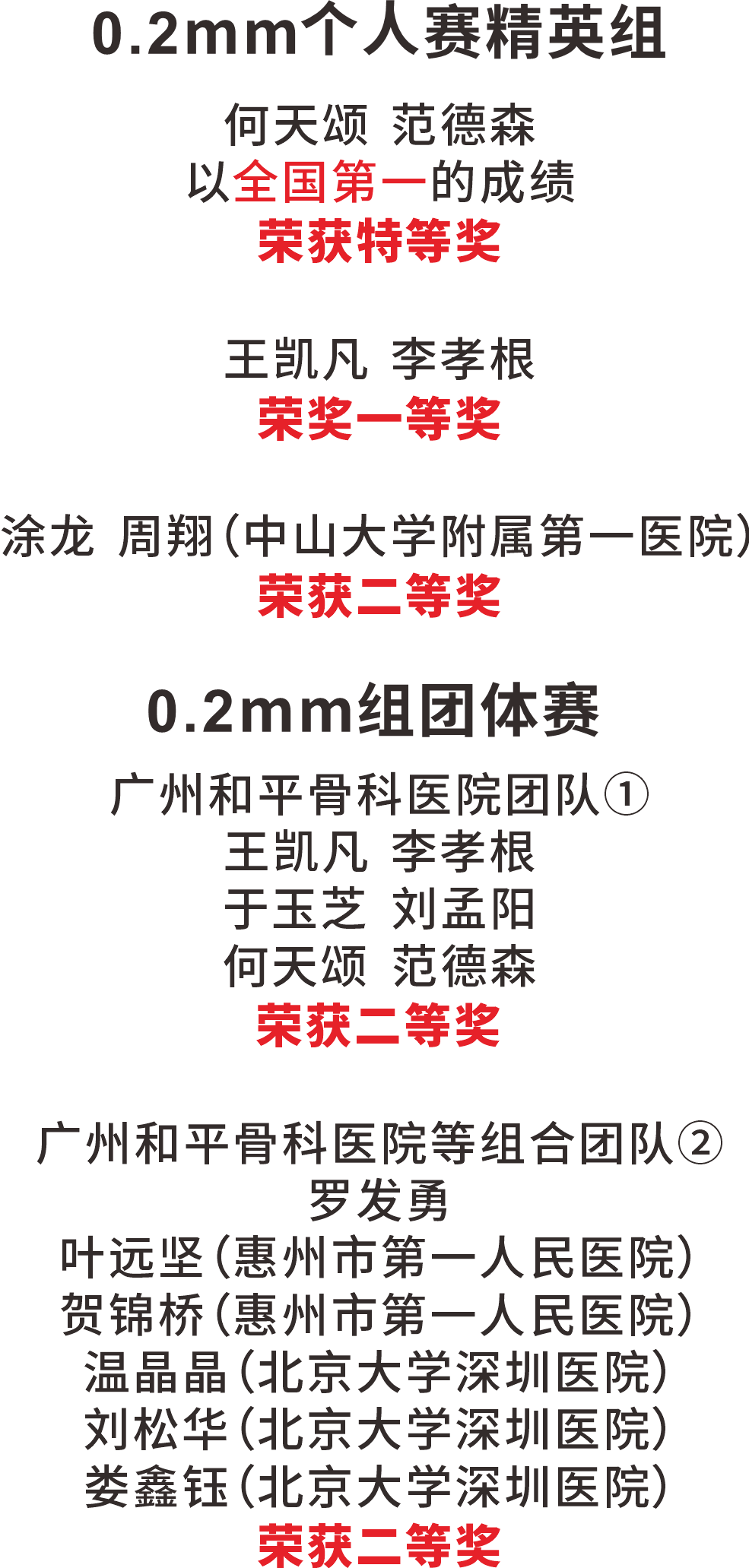 在这场代表我国显微外科最高水平的赛事中,广州和平骨科医院显微外科团队在领队王小立副院长、教练周洋主任及罗发勇医生的带领下,与全球顶尖好手同台竞技,凭借“高精尖”技术和卓越心理素质在众多强劲对手中脱颖而出,斩获多项大奖:0.2mm 组团体赛二等奖两个, 0.2mm 个人赛精英组特等奖、一等奖、二等奖各一个。